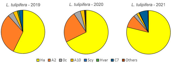 Harmonia axyridis was the dominant species during the three years of sampling on L. tulipifera, followed by A. bipunctata. The former’s relative yearly abundance increased significantly over the period of 2019–2021 (χ2 = 426.46; p < 0.0001; df: 12) (Figure 2, Table S3).