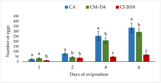 Number of eggs laid by females of Bactericera cockerelli in three varieties of pepper, on different days of oviposition. CA: chili pepper ‘Arbol’, CM-334: ‘Criollo de Morelos 334’, CJ-2018: ‘Criollo de Jojutla 2018’. Each point represents the average of 10 repetitions corresponding to two repetitions of the test. Values with different letters each time were significantly different (Tukey test p < 0.05).