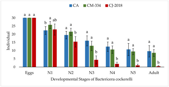 Development of Bactericera cockerelli fed with chili plants of the ‘Arbol’ variety (CA), ‘Criollo de Morelos’ (CM-334), or ‘Criollo de Jojutla’ (CJ-2018). N1: First instar nymph, N2: Second instar nymph, N3: Third instar nymph, N4: Fourth instar nymph, N5: Fifth instar nymph. Each point represents the average of 10 repetitions with 30 individuals each. Values with different letters in each developmental stage are significantly different (Tukey test p < 0.05).