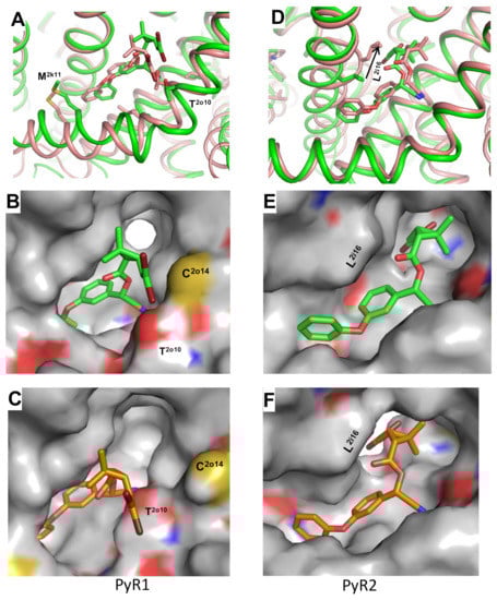 Table 1 shows kdr mutations for which respective wild-type residues are within 4 Å from the pyrethroids that we docked into the PyR1 and PyR2 sites, as described below (Section 3.2 and Section 3.3). Table 2 shows engineered mutations within the PyR1/PyR2 sites that were generated and confirmed earlier in functional studies.