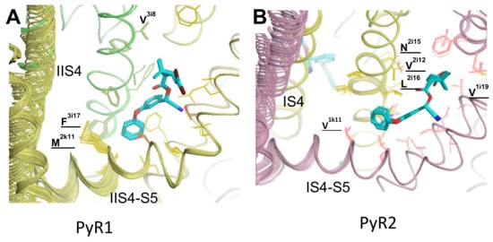 An H-bond between the side chain of N2o8 and the backbone carbonyl of G1k3 (Figure 5f) stabilizes the mutual disposition of helices IIS4-S5 and IIS5, which contribute to the PyR1 site. This may explain why engineered mutation N2o8I decreased the action of DMT. It should be noted that N2o8I, as well as Lk7F/I, which do not form direct contacts with pyrethroids, strongly decreased the action of DMT, but not PMT [68]. In view of our models, DMT is more sensitive than PMT to the mutations-associated deformations in the PyR1 site because the nitrile group of DMT makes an additional contact with T2o10 in the PyR1 site (Figure 2a,b). The fact that C2i14 makes specific contacts with DMT in both of its binding orientations (Figure 2a,c), but not with PMT (Figure 1c), explains why mutation C2i14A decreases the channel sensitivity to DMT, but not to PMT [68].