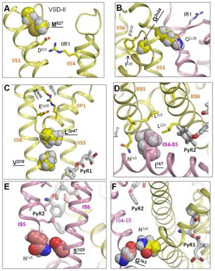 Residues beyond the PyR1 and PyR2 sites form intersegment contacts whose destruction would allosterically affect the action of pyrethroids. Labels of residues that are subject to kdr mutations are bold-underlined (see Section 3.6 for more detail). Panels (A–F) show, respectively, contacts of residues M827, G2o24, L2p47/S2.p55, I1k7, S1i29 and G1k3.