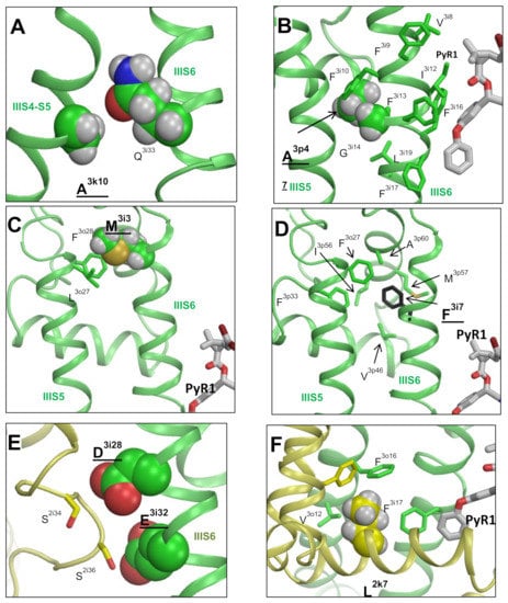 Residues beyond the PyR1 and PyR2 sites form intersegment contacts whose destruction would allosterically affect the action of pyrethroids. Labels of residues that are subject to kdr mutations are bold-underlined (see Section 3.6 for more detail). Labels of residues, which are not subject of kdr mutations, but to their engineered substitutions, are explored in functional studies and are bold-typed. (see Section 3.8 for more detail). Panels (A–F) show, respectively, contacts of residues A3k10, A3p4, M3i3, F3i7, D3i28/E3i32 and L2k7.