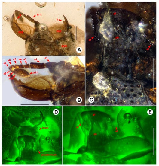 Figure 2B) with 11 antennomeres; club formed by three apical antennomeres; scape long, broad, pedicel cylindrical, about three times as long as antennomere III; antennomere III–V shorter, longer than wide; antennomere VI–VIII intestiniform; antennomere IX–XI forming a club, strongly transverse, surface covered with dense short setae, apex of antennomere XI rounded. Mandible (