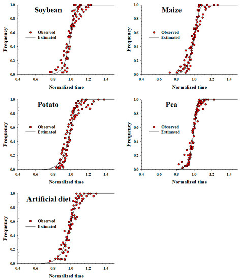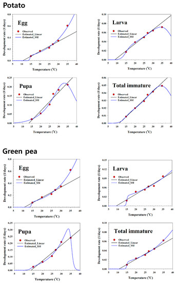 8], who estimated 28.5 °C on sugar beet. The T low values estimated by the SSI model varied between 12.11 °C and 14.91 °C, and the T high values estimated by the SSI model for the total immature stage were 35.6 °C on soybean, 37.1 °C on maize, 37.9 °C on potato, 50.3 °C on green pea, and 37.0 °C on the artificial diet (