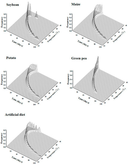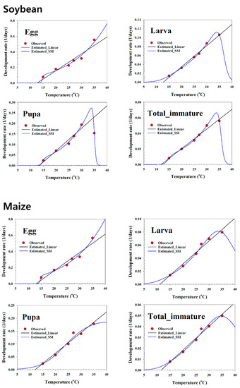 values in this study using the SSI model were 26.6 °C on soybean, 23.6 °C on maize, 22.3 °C on potato, 33.1 °C on green pea, and 26.7 °C on the artificial diet, which differ from those of [