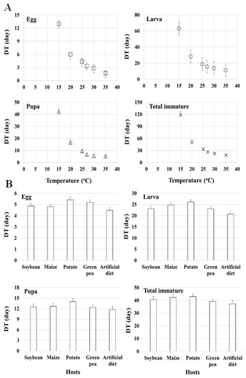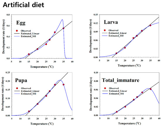8] reported lower LDTs for the egg, larva, and pupa stages on sugar beet than we estimated on soybean and the artificial diet.