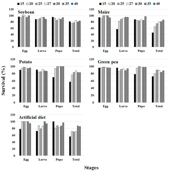 S. exigua was found at 30 °C on soybean, while the shortest was found at 35 °C on potato. As stated above, longevity differences among plant hosts can also be related to the nutritional quality and quantity of plant host species as well as the primary and secondary biochemical contents available on those plant hosts [