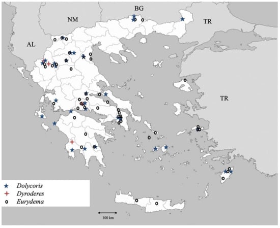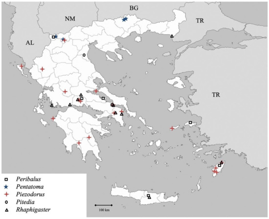 There have been sporadic references on specific species of Pentatomoidea in Greece [8,12,13,14,15,16,17,18,19,20,21,22,23,24,25,26,27,28,29,30,31,32,33,34,35,36,37,38,39,40,41,42,43], and two overall studies, one in 1980 [44] and the other in 2019, which updated the previous one and included all new species [45]. Given the worldwide problem of the brown marmorated stink bug pest status [6] and its presence in Greece [8], understanding this family in Greece may assist in distinguishing this pest species from native ones, and provide more targeted response for future detections of this pest. The aim of the present study is to present new records and an updated checklist of the Pentatomoidea of Greece.