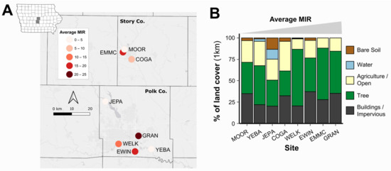 Minimum infection rates and landscape ecologies vary across mosquito trapping site locations. Study site locations in central Iowa showed substantial variation in mosquito minimum infection rates (MIRs, averaged from 2016–2018) (A) and displayed a wide range of landscapes, with land use classifications calculated by remote sensing within 1 km of trap sites (B).
