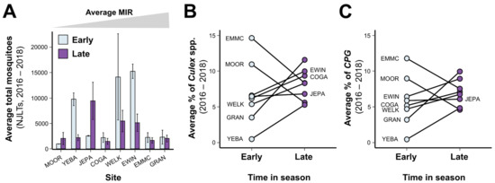 Mosquito communities vary across study sites and temporally during the season. Total mosquito numbers collected from NJLTs were averaged from 2016–2018 and displayed by site in order of increasing mosquito MIR (A). Data are displayed as the average ± SEM for the early (weeks 20–31) and late (weeks 31–40) times of the year. The average percentage of Culex spp. (B) or Culex pipiens group (CPG) mosquitoes (C) collected at each site compared with the total number of mosquitoes are displayed for both the early and late seasons. Connecting lines are to aid in the visualization of the data between time points.