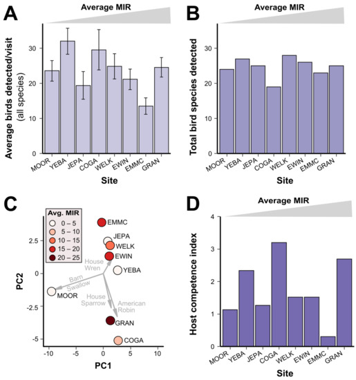 To determine how avian communities differed across our sites, we calculated the overall abundance (average number of birds detected per visit; Figure 3A, Tables S6 and S7), species richness (total species detected; Figure 3B), and alpha diversity metrics (Simpson’s and Shannon’s diversity index; Table S2). Although there were no clear differences in these community metrics between sites (Figure 3A,B), the abundance of specific bird species can distinguish sites by principal component analysis (Figure 3C). In addition, for each site, we calculated the host competence index [31], an indicator of how well a given bird community should serve as a functional WNV reservoir (Figure 3D). However, none of these community metrics displayed obvious associations with mosquito infections (MIRs) at our trapping locations (Figure 3). Metrics of avian communities were less variable across sites (CV range: 5.5–53.6%; Table S2) than were metrics of mosquito communities (CV range: 26.6–114.7%, Table S1), suggesting that bird communities are more uniform across site locations than Culex mosquito populations.