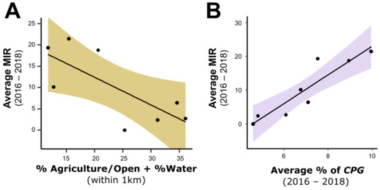 Ecological differences in land use have also been implicated in shaping WNV transmission [7,23,54,55,57] due to their importance in defining mosquito and bird communities, as well as human population density and human activity in a given area. Similar to a previous study [54], we demonstrate that the mixture of impervious surfaces and green spaces often associated with suburban locations could enhance the potential for WNV transmission. In contrast, our predictive models, including the abundance of agricultural areas, display negative correlations with mosquito infection rates. These contrasting contributions are expected from peridomestic mosquito vectors, such as Cx. pipiens and Cx. restuans, which are associated with urbanized locations [20,68,69], and likely drive patterns of urban WNV transmission [17,54,70]. Within our geographically limited sample, however, these landscape features remained only weakly predictive of MIR (Table 1). Yet, at a larger ecological scale in Iowa and the greater Midwest/Great Plains region, where Cx. tarsalis drives WNV transmission in more rural areas, agricultural landscapes are important predictors of WNV cases in humans [4,13,23,57].