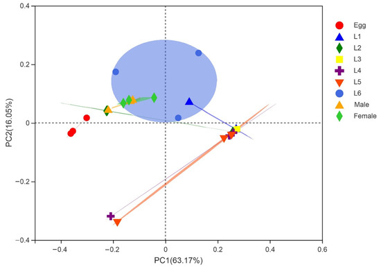 3.3. Common and Unique Microbes among All Developmental Stages of S. frugiperda