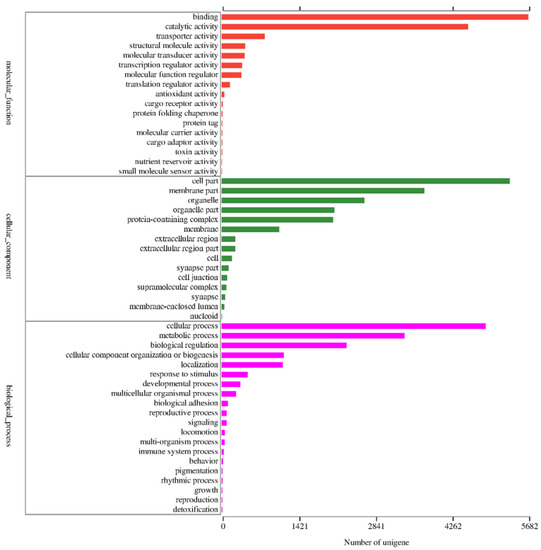 The connector sequences in the raw reads and the reads without inserted fragments were removed. Low-quality reads, including reads containing > 10% N and median quality value (Q) ≤ 25, were also removed to generate clean reads. All clean-read datasets were used for de novo assembly by Trinity (https://github.com/trinityrnaseq/trinityrnaseq/wiki, accessed on 10 December 2021). Then, the trinity outputs were estimated by TransRate (http://hibberdlab.com/transrate/, accessed on 10 December 2021) and redundant sequences were removed by using CD-HIT (http://weizhongli-lab.org/cd-hit/, accessed on 10 December 2021).Unigenes were functionally annotated by BLAST-searching the databases against the NCBI non-redundant protein sequences (NR), Pfam, Clusters of Orthologous Groups of Proteins (COG), Kyoto Encyclopedia of Genes and Genomes (KEGG), Gene Ontology (GO), and Swiss-Prot databases.