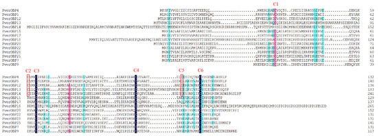 In this study, 19 candidate OBPs (four newly compared with antennae) were identified from the foreleg’s transcriptome data of P. versicolora. The complete ORF was detected in 14 OBPs, with lengths ranging from 129 to 266 amino acids. Among them, 14 OBPs had a signal peptide sequence (Table S2). The further alignment of these 14 amino acid sequences showed that four OBPs belonged to the classical OBP subgroup with the six conserved cysteine (C) residues. Nine OBPs belonged to the minus-C OBP subgroup with four conserved C residues (Figure 2). The phylogenetic analysis showed that PverOBP4 and PverOBP12 clustered with MaltOBP3 and MaltOBP10, two proteins that bound plant-related compounds (Figure 3).