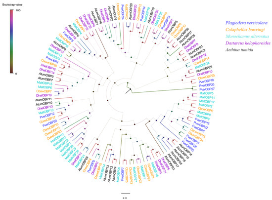 Phylogenetic analysis of the OBPs (odorant-binding proteins) from five insect species: P. versicolora (Pver), C. bowringi (Cbow), M. alternatus (Malt), D. helophoroides (Dhel), and A. tumida (Atum). The amino acids sequences without signal peptides were used. The P. versicolora genes are shown in blue.