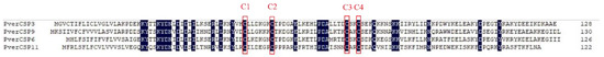 Alignment of the full-length amino acid sequence of CSPs identified in this study. Conserved cysteine residues are marked with a red box.