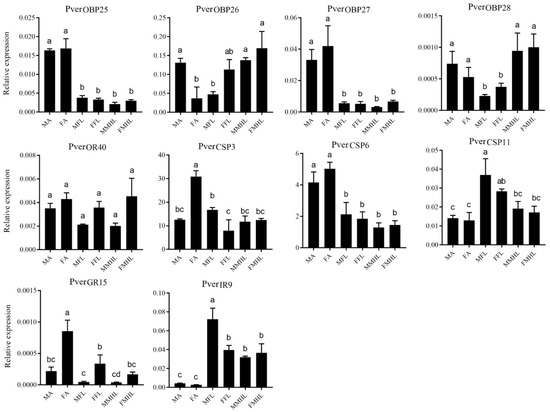 RT-qPCR was used to analyzed the tissue specific expression profile of 10 chemosensory genes in the antennae and legs (Figure 7). In the expression analyses, 13 candidate chemosensory genes that were newly identified in the forelegs (Figure S1) were chosen, and 8 (OBP25, OBP26, OBP27, OBP28, OR40, CSP11, GR15, and IR9) specific RT-qPCR primer were obtained. In addition, two PverCSPs (CSP3 and CSP6) were chosen that were both identified from forelegs and antennae. The results showed that PverOBP25 and PverOBP27 were highly expressed in the antennae of males and females. PverOBP28 was highly expressed in the antennae, as well as middle and hind legs than in the forelegs. The results revealed that the expression level of PverOR40 had no significant difference in antennae, forelegs, and middle and hind legs. The tissue expression profiles showed that PverCSP3 had a higher expression in female antennae and PverCSP6 in male and female antennae. In addition, PverCSP11 was highly expressed in male forelegs than in the antennae, and middle and hind legs. PverGR15 expression levels in female were significantly higher than in the male antennae and forelegs. PverIR9 has a higher expression in the forelegs, and middle and hind legs than in the antennae.