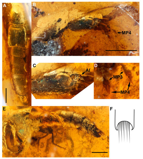 Coomania megistos sp. nov. Holotype SNUC-Paleo-0104. (A), dorsal view. (B), right side of head in lateral view. (C), close up of right side of head. (D), maxillary palpi. (E), left side of abdomen in lateral view. (F), drawing of tergite IX in dorsal view. Scale bars-1 mm. AI-antennal insertions; MP-maxillary palpomere.