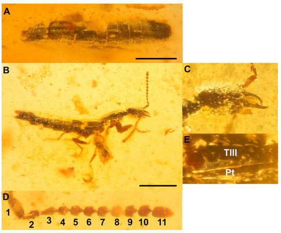 - Chatzimanolis, S. A Review of the Fossil History of Staphylinoidea. In Biology of Rove Beetles (Staphylinidae)—Life History, Evolution, Ecology and Distribution, 1st ed.; Betz, O., Irmler, U., Klimaszewski, J., Eds.; Springer: Berlin/Heidelberg, Germany, 2018; pp. 27–45. [Google Scholar]