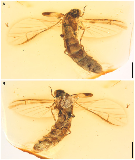 The fossil record of Lymexylidae is relatively abundant. Many lymexylid fossils have been recently reported from several Mesozoic and Cenozoic deposits. Almost all known fossils from the family are from amber deposits [3,4,5,6,7,8,21]. As resiniferous deposits seem to entrap arthropod fauna living primarily in or near the resiniferous trees [22], a potential relationship between the family and gymnosperm trees, the source of Kachin, Baltic and Rovno ambers [23,24,25,26], can be postulated, given the close developmental association of modern lymexylids with trees (see Section 4).