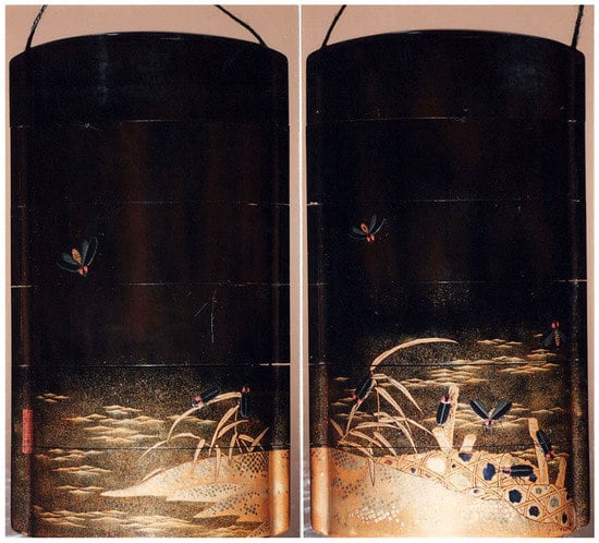 (T100). Two sides of Case (Inrō) with Design of Fireflies in Flight and Climbing on Stone Baskets and Reeds at the Shore. Noneteenth C. Unknown artist (Japanese). Lacquer, roiro, gold and coloured hiramakie, togidashi, nashiji, kirigane; Interior: nashiji and fundame. H.O. Havemeyer Collection, Bequest of Mrs. H.O. Havemeyer, 1929. Accession Number: 29.100.913. The Metropolian Museum of Art, New York, NY, USA, www.metmuseum.org (accessed on 4 January 2022). Open access image, CC0.