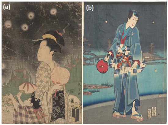 The Metropolian Museum of Art, New York, USA, www.metmuseum.org (accessed on 4 January 2022). Open access images, CC0. (a) (T16). Woman and Child Catching Fireflies. ca. 1793. Eishōsai Chōki (Japanese, active late 18th–early 19th C.). Woodblock print; ink and color on paper. H.O. Havemeyer Collection, Bequest of Mrs. H.O. Havemeyer, 1929. Accession Number: JP1739. (b) (T67). Modern Genji—Firefly Viewing (Imayō genji shiken hotaru asobi). 1961. Toyohara Kunichika, (Japanese, 1835–1900). Central sheet of a triptych; woodblock print, ink and color on paper. Museum Accession. Accession Number: JP1093.1.