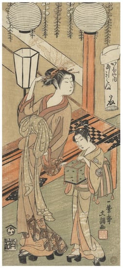 (T2). Courtesan and Attendant with a Cage of Fireflies. ca. 1770. Ippitsusai Bunchō (Japanese, active ca. 1765–1792). Woodblock print; ink and color on paper. Gift of Estate of Samuel Isham, 1914. Accession Number: JP907. The Metropolian Museum of Art, New York, NY, USA, www.metmuseum.org (accessed on 4 January 2022). Open access image, CC0.