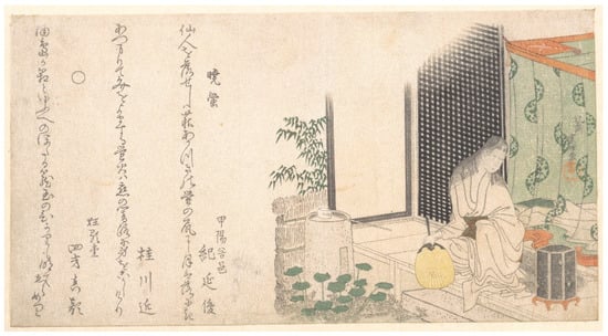 (T41). Cage of Fireflies at Dawn in Summer. ca. 1800. Katsushika Hokusai [Japanese, Tokyo (Edo) 1760–1849]. Woodblock print (surimono); ink and color on paper. The Howard Mansfield Collection, Purchase, Rogers Fund, 1936. Accession Number: JP2577. The Metropolian Museum of Art, New York, NY, USA, www.metmuseum.org (accessed on 4 January 2022). Open access image, CC0.