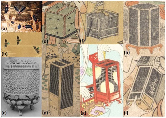 Examples of fireflies and firefly cages: (a) detail from Figure 1, (b) detail from T163, (c) T65 (cropped), (d) detail from Figure 6 (T2), (e) detail from Figure 3a (T16), (f) detail from Figure 5 (T186), (g) detail from Figure 4 (T12), (h) detail from Figure 7 (T41), (i) detail from Figure 5 (T186). The Metropolian Museum of Art, New York, NY, USA, www.metmuseum.org (accessed on 4 January 2022). Open access images, CC0.