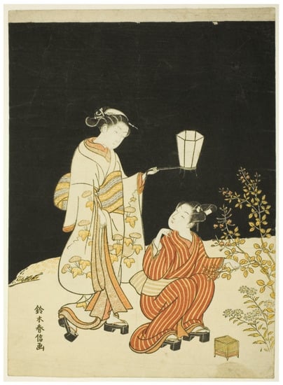 (T30). Searching for Fireflies. ca. 1768. Suzuki Harunobu (Japanese, 1725–1770). Color woodblock print, chūban. Clarence Buckingham Collection. Reference Number: 1952.327. The Art Institute of Chicago, IL USA, https://www.artic.edu/artworks/77297/searching-for-fireflies (accessed on 4 January 2022). Open access image, CC0.
