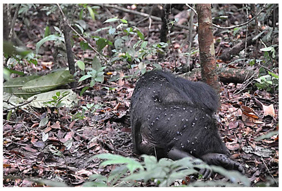 One could ask if non-bloodsucking flies ever show a close association with groups of NHP and, would this put them in a position to pick up and transfer pathogens they house? The answer is yes, but a lot more research needs to be done. “Primate-associated flies were observed to move between groups of different species, suggesting that they could be involved in transmitting the yaws pathogen between species, even when NHPs are not found in mixed-species associations” [27]. A recent report by Gogarten [67] notes that by studying the fly and monkey associations that larger monkey groups harbored higher fly densities. Figure 2. shows the close association between flies and a sleeping chimpanzee. Gogarten’s paper [67] is a must-read if one wants to know more about whether NHPs have developed defensive behaviors against nuisance flies and what we should call this close association with NHP.