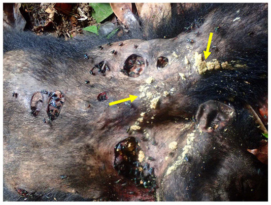 Flies feeding and laying eggs (arrows) on a dead chimpanzee. Photo courtesy of Jennifer Jaffee and the Tai Chimpanzee Project.
