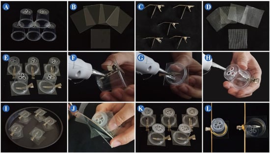Process of making clip cages. (A) Plastic cups with holes in the bottom. (B) Cropped polyvinyl chloride sheets. (C) Bent duck-bill clips. (D) Cut nylon organdy mesh. (E) Assembly of materials in (A–C). (F) Apply hot melt glue to the junction of the clip and the plastic cup. (G) Glue the clip to the polyvinyl chloride sheet. (H) Apply a ring of hot melt glue to the bottom of the cup. (I) Seal the clip cage with nylon organdy mesh placed on a non-stick pan. (J) Trim the edges of nylon organdy mesh. (K) Finished clip cage. (L) Clip cage assembled with elastic bands and bamboo skewers.