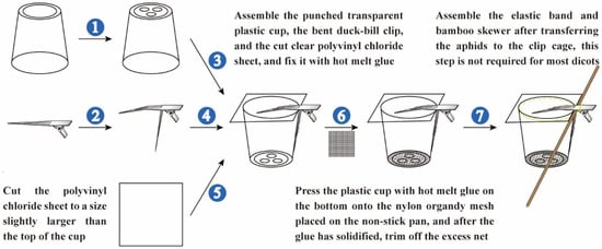 This study reports the construction and application of modified clip cages made of plastic cups and metal duck-bill clips that can confine aphids or other small insects to certain parts of leaves. These cages facilitate estimating the antibiosis parameters of aphids, collecting honeydew, and observing the physiological phenotype of aphid-infested leaf segments. Compared with the classic clip cages [36], these modified clip cages allow for better attachment to monocots and are convenient to produce.