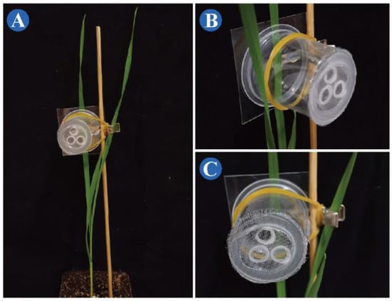 Integrated pest management (IPM) techniques are important for pest control [22]. In IPM programs, it is necessary to understand the growth, development, and reproduction of pests under varied conditions of temperature, insecticide usage, and cultivars [23,24,25,26,27]. Evaluating the antibiosis of plants against aphids through no-choice tests, for example, life table studies, nymph mortality, and adult fecundity, is an important part of crop protection research [23,28,29,30]. In no-choice studies, aphids are generally confined to whole cages or clip cages, either individually or in groups [24,26,31,32,33,34]. Whole cages can cover all plants in a pot, while clip cages only accommodate a small portion of the leaves [35]. In whole cages, it is difficult to find a single aphid that is small and freely moves over the entire plant. Additionally, checking or removing molts and new nymphs from the entire plant is not easy [36]; therefore, clip cages are necessary in no-choice studies, especially for investigations of individual aphids. Clip cages are now widely used to study the effects of factors such as temperature, cultivar, carbon dioxide levels, soil nutrient status, and insecticide concentrations on the settlement, biomass, survival, and reproduction of small insects [26,34,37,38,39].
