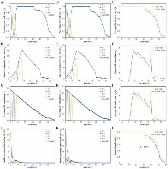 (A,B) Age-stage survival rate (sxj), (C) age-specific survival rate (lx), (D,E) age-stage reproductive value (vxj), (F) age-specific fecundity (mx), (G,H) age-stage life expectancy (exj), (I) age-specific maternity (lxmx), (J,K) stable age-stage distribution (SASD), and (L) survival probability of Sitobion avenae confined to clip cages (A,C,D,F,G,I,J,L) and whole cages (B,C,E,F,H,I,K,L). Kaplan–Meier curves were constructed and log–rank (Mantel–Cox) tests were performed to detect differences in survival probability between the two cage groups. N1: first instar nymph; N2: second instar nymph; N3: third instar nymph; N4: fourth instar nymph.