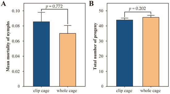 To further validate the applicability of the clip cages, the nymph mortality and adult fecundity were investigated. No significant difference was observed in the nymph mortality (p = 0.772) between the clip cage and whole cage groups, which were 8.615% ± 1.181% and 7.071% ± 0.984%, respectively (Figure 5A). For adult reproduction, five third or fourth instar nymphs produced 44.200 ± 0.987 and 45.985 ± 0.990 offspring within 6 days in the clip cage and whole cage groups, respectively (Figure 5B). Differences in adult fecundity between the two groups were not detected by the unpaired t-test (p = 0.202) (Figure 5B); thus, the clip cages can be used for aphid antibiosis research.