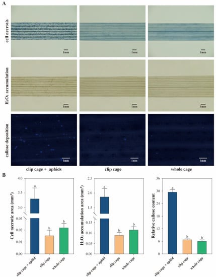 Plants defend themselves from insect attacks by a localized defense mechanism, namely, a hypersensitive response [57]. Most herbivorous attacks result in reactive oxygen species bursts, cell wall cross-linking, altered membrane permeability, callose deposition, and phytoalexin accumulation, ultimately leading to programmed cell death [57]. Histochemical staining was performed to investigate the effect of the clip cages on plant defense responses. The current work revealed that the hydrogen peroxide accumulation, callose deposition, and cell necrosis were similar between the clip cage and whole cage groups, but they significantly increased for the treatment groups of the clip cages with aphids (Figure 6). The results indicated that the clip cages did not cause oxidative bursts around the feeding sites and, thus, did not trigger changes in the plant physiology or secondary metabolites, whereas the aphids induced strong defensive responses. In addition, previous studies have shown that clip cages may alter leaf physiological characteristics, such as light saturation, CO2 exchange rate, soluble protein content, leaf area, leaf temperature, and chlorophyll content [58,59]; thus, the interpretation of the data might be compromised when the focus of a study is related to plant development. Further studies should be performed to confirm the changes in plant growth and development induced by the clip cages.