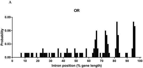 Differences in gene structure provide important information on the evolution of gene families, including intron numbers, insertion sites, phases and sizes. In general, orthologous chemoreceptor genes across insects have conserved gene structures [57,58,59]. As expected, most orthologous ORs or GRs exhibited the same intron numbers, insertion sites and phases, as well as similar intron sizes. Taking Orco genes as an example, they had nine introns and identical intron phases (1–2–1–0–1–2–0–0–0) in all six species. Similarly, GR2 genes comprised eight introns and the same phases of 0–1–0–0–2–0–0–0 (Table S1). By analyzing insertion positions of introns, the majority of introns were located on the latter parts of genes, i.e., 60%–100% of regions of an OR or GR gene (Figure 2A,B).