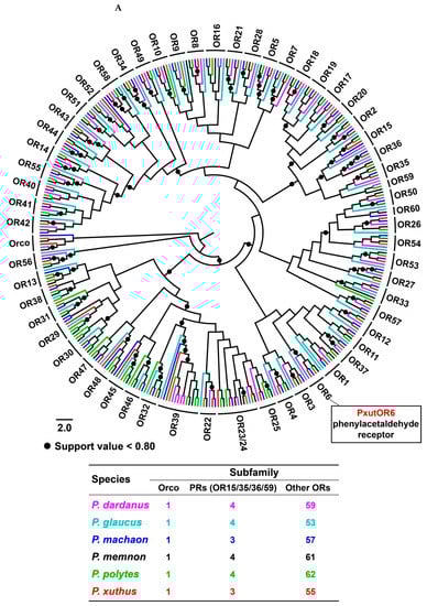With an aligned protein sequence of 374 ORs from six Papilio species, we constructed a maximum likelihood tree using FastTree v2.1.11. Following the classification of ORs in Lepidoptera, Papilio ORs were composed of three subfamilies, i.e., Orco, PRs and other ORs that were further divided into 60 orthologous groups (Orco, OR1–OR23/24 and OR25–OR60). This Orco clade shared a high degree of conservation (a mean amino acid identity of 97.61%) across six Papilio species, with a high support value (100%) and 1:1:1:1:1:1 orthology. Such one-to-one orthologous relationships among six species were presented in other 44 OR groups, including three of four PR clades (OR15/OR35/OR36) as well as putative phenylacetaldehyde-sensitive OR6s (Figure 4A). The remaining 15 orthologous groups had more or fewer gene gains or losses of ORs. For example, P. dardanus possessed six gene copies of OR39. Four paralogs in OR23 and OR39 groups were identified from P. memnon and P. polytes, respectively. In addition, some species lost several OR orthologs, especially P. glaucus, where four clades (OR23–OR25 and OR47) did not comprise PglaORs. Members of a candidate PR clade OR59 were absent in P. machaon and P. xuthus (Table 1).