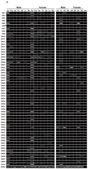 Out of the six Papilio butterflies, we chose P. xuthus to study the expression profiles of 59 PxutORs in 14 adult tissues and eight reproductive tissues of both sexes. Except for PxutOR6, the expression of all 58 PxutOR genes was detectable in at least one tissue. The majority of genes had specific or high expression in female and male antennae, accounting for 89.66% (52/58) of the genes. By focusing on antenna-exclusive genes, nine PxutORs were found to have such an expression, including PxutOR2/OR7/OR13/OR33–OR35/OR44/OR49/OR50. Moreover, some genes appeared to exhibit sex-biased levels in the antennae, such as PxutOR2/OR8/OR23/OR42/OR53 in females and PxutOR27/OR40/OR44 in males. Outside the antennal tissue, a certain number of genes were expressed in proboscises, legs and non-chemosensory tissues. In particular, 31 genes had detectable expression in at least one reproductive tissue. This coreceptor PxutOrco and three candidate PxutPRs (PxutOR15/OR35/OR36) were enriched in the antennae (Figure 7A).