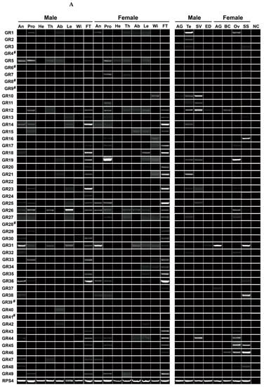 The female P. xuthus use their foreleg tarsi to drum the surface of the leaves of host plants before laying eggs. As a contact chemoreception behavior, taste-associated genes such as GRs are key molecular candidates in foreleg tarsi [29,60]. Hence, we additionally collected foreleg tarsi of both sexes to investigate the expression of 49 PxutGRs in 24 tissues. Seven of them (PxutGR4/GR6/GR8/GR9/GR28/GR39/GR41) had no detectable expression in all tested tissues. Of the remaining 42 genes, as many as 28 relatives were expressed in foreleg tarsi, where 11 genes appeared to be female-biased relatives. Additionally, 9 and 19 genes were detected separately in antennae and proboscises, although most of them showed extremely low expression levels. Similar to ORs, a comparable number of GRs had the expression in reproductive tissues, summing to 25 genes expressed in at least one tissue (Figure 8A).