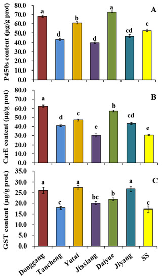P450s (A), CarE (B), and GST (C) contents of six L. striatellus populations in Shandong Province. The data are the mean ± SE (n = 3), and different letters on the bars indicate significant differences (p < 0.05).