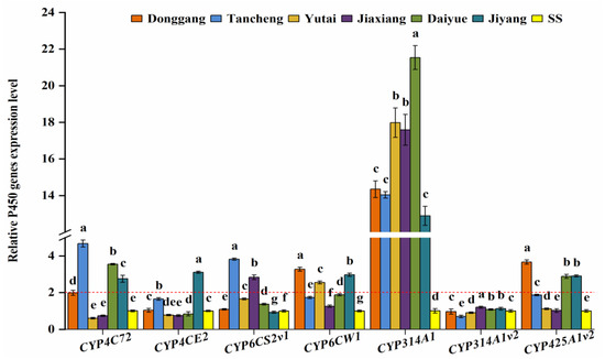 The relative expression levels of seven P450 genes in six L. striatellus populations from Shandong Province compared with SS (red dotted line means 2-fold overexpression level). The data are the mean ± SE (n = 3), and different letters on the bars indicate significant differences (p < 0.05).