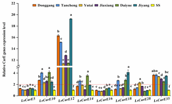 As shown in Figure 3, compared to SS, the three CarE genes (LsCarE10, LsCarE12, and LsCarE35) were relatively over-expressed up to more than 2-fold in all six field populations, among which LsCarE12 showed a high expression level of more than 10-fold change (from 11.39- to 19.27-fold). However, two CarE genes (LsCarE5 and LsCarE16) were less than 2-fold in all the field populations. LsCarE18 was significantly up-regulated in the Jiyang, Daiyue, and Tancheng populations with 4.13-, 2.78-, and 2.69-fold, respectively. LsCarE14 also was significantly up-regulated in the Daiyue and Tancheng populations (3.56- and 2.65-fold, respectively). Only LsCarE28 was significantly up-regulated in the Yutai population (2.31-fold).