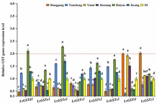 The relative expression levels of eight GST genes in six L. striatellus populations from Shandong Province compared with SS (red dotted line means 2-fold overexpression level). The data are the mean ± SE (n = 3), and different letters on the bars indicate significant differences (p < 0.05).
