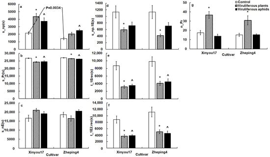 The general variables of B. brassicae probing behavior on the two oilseed rape cultivars in the TuMV-infected and mock-inoculated treatments. The p value on the white columns indicates a statistical difference between the two cultivars; (a), the impact of TuMV infection on total non-probing time of aphids; (b), the impact of TuMV infection on total probing time of aphids; (c), the impact of TuMV infection on total no phloematic duration of aphids; (d), the impact of TuMV infection on non-probing duration before the first phloem contact of aphids; (e), the impact of TuMV infection on time from the start of EPG to the first phloem contact of aphids; (f), the impact of TuMV infection on time from the start of EPG to the first ingestion of aphids; (g), the impact of TuMV infection on probing frequency of aphids; * on the gray columns denotes a statistical difference between infected plant and mock-inoculated control in the same cultivar; ^ on the black columns indicates a statistical difference between viruliferous aphids and non-viruliferous aphids in the same cultivar. The acronym of the variables is defined in Table 1.