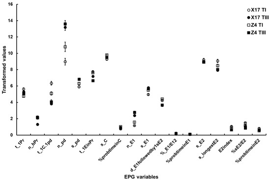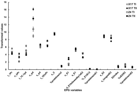 Figure 2. The major EPG variables of B. brassicae probing behavior on the two oilseed rape cultivars with different TuMV infection status. X17 T1 represents treatment I (feeding behavior of non-viruliferous aphids on uninfected plants) on Xinyou17; X17 TII represents treatment II (feeding behavior of non-viruliferous aphids on infected plants) on Xinyou17; Z4 T1 represents treatment I (feeding behavior of non-viruliferous aphids on uninfected plants) on Zheping4; Z4 TII represents treatment II (feeding behavior of non-viruliferous aphids on infected plants) on Zheping4. A summary of the two-way ANOVA, comparing the major EPG variables of aphid probing behavior between the two cultivars with different TuMV infection status, is presented Table 5. The acronym of the variables is defined in Table 1.